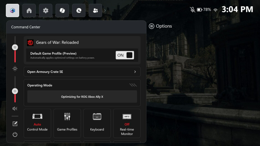 Los perfiles pueden activarse o desactivarse desde el Game Bar del Armoury Crate Command Center, donde aparece un switch ON/OFF en la parte superior.