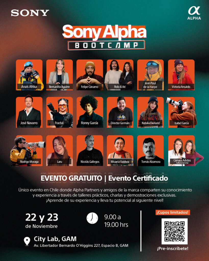 Sony Chile presenta el Boot Camp Sony Alpha 2025, un evento único pensado para reunir a fotógrafos, realizadores audiovisuales y creadores de contenido. La actividad se llevará a cabo el 22 y 23 de noviembre en el moderno City Lab del Centro Cultural Gabriela Mistral (GAM).