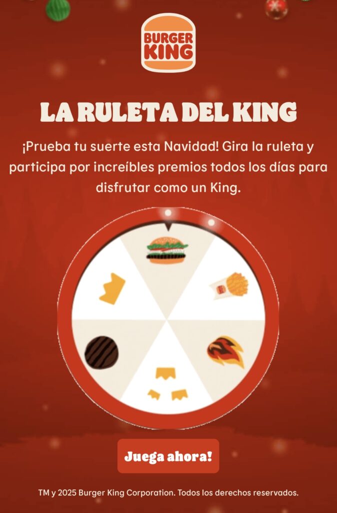 En el marco de las celebraciones de fin de año, Burger King habilitó una entretenida Ruleta de Navidad dentro de su renovada aplicación Mi BK, una iniciativa pensada para premiar a los usuarios registrados que decidan probar su suerte con solo tocar la pantalla.