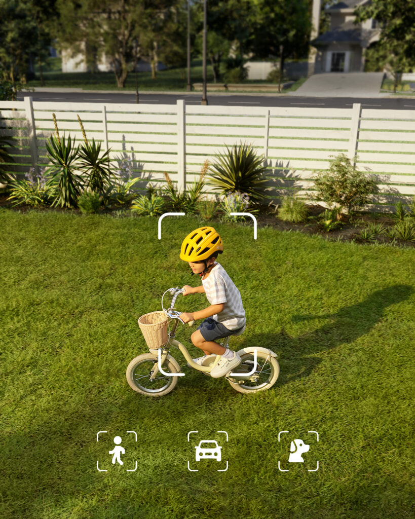 La E340 cuenta con focos LED de 2.000 lúmenes que se activan automáticamente al detectar movimiento, iluminando entradas y manteniendo alejados a posibles intrusos. Su paneo de 360° y zoom híbrido permiten vigilar cada rincón, eliminando los puntos ciegos.