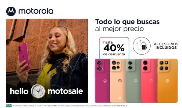 Motorola celebra las celebraciones dieciocheras con atractivas promociones en smartphones. Durante el MotoSale, que se extiende del 1 al 14 de septiembre, los usuarios podrán acceder a rebajas de hasta 40% en www.motorola.cl y en tiendas físicas Motorola Store. Una oportunidad ideal para renovar tu equipo y conocer todas sus funciones.