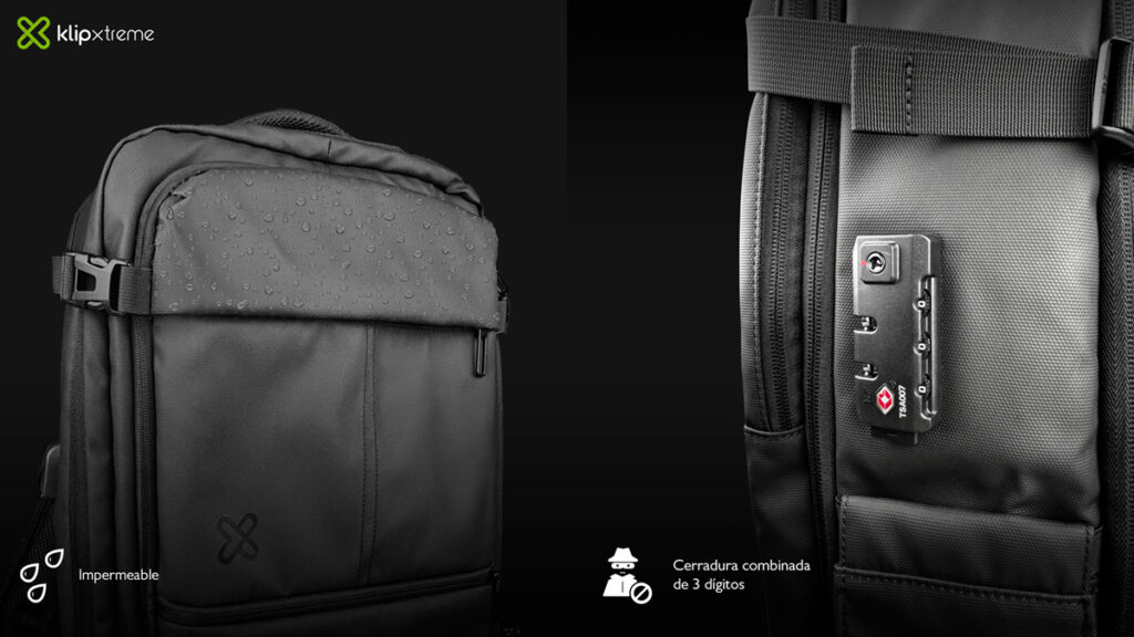 Para quienes dependen de sus dispositivos, integra un puerto USB externo que facilita la carga en movimiento (banco de energía no incluido). En cuanto a ergonomía, incorpora correas acolchadas con tecnología de distribución uniforme del peso, lo que la hace cómoda incluso en trayectos prolongados.