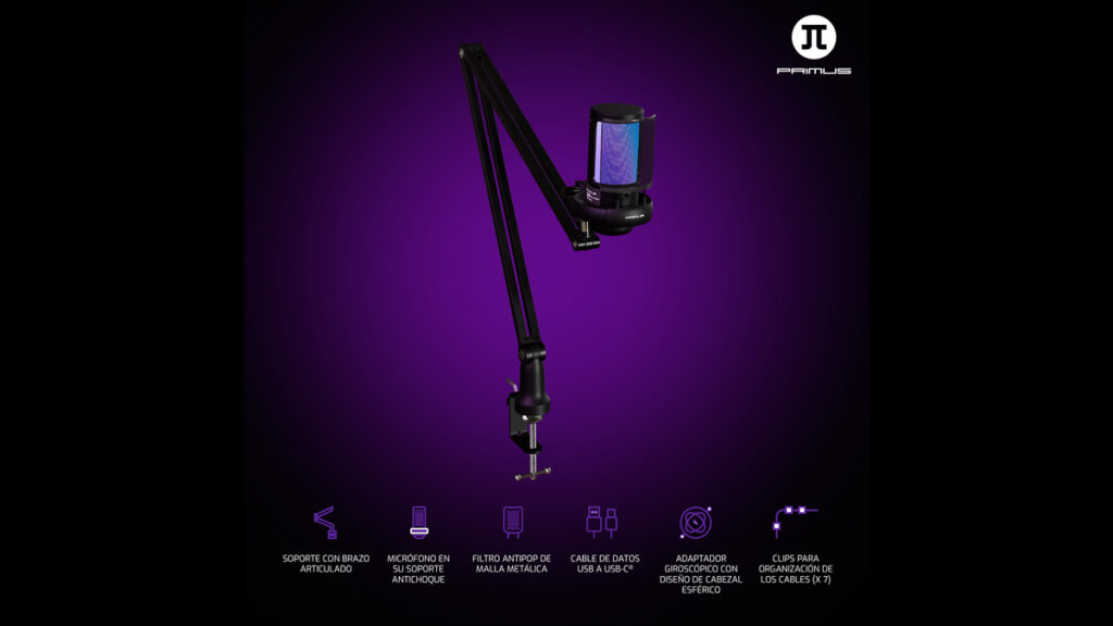 Una solución de audio pensada para convertir cualquier espacio en un entorno de grabación de alta calidad, combinando un micrófono de condensador de alto desempeño con un brazo metálico ajustable, accesorios especializados y efectos de iluminación LED personalizables.