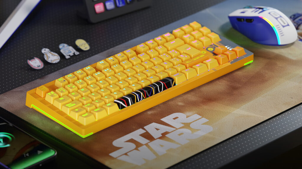 El teclado incorpora 18 efectos de iluminación RGB preconfigurados, permitiendo personalizar la experiencia visual, mientras que su acabado dorado evoca la elegancia característica de C-3PO.