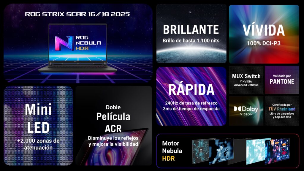 Ambas laptops integran pantallas ROG Nebula HDR Mini LED con resolución 2.5K, 240Hz de tasa de refresco, brillo de hasta 1200 nits y cobertura total del espectro DCI-P3. La nueva tecnología ACR reduce los reflejos un 55 % y mejora el contraste en 4,5 veces, además de ofrecer un ángulo de visión de 180°, ideal para entornos competitivos y de streaming.