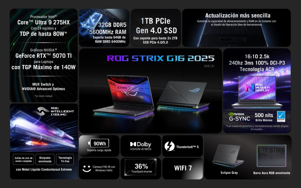 También estará disponible próximamente la ROG Strix G16 2025 (G615) con GPU RTX 5070 Ti, a un precio aproximado de $3.299.990 CLP. A diferencia de la serie SCAR, cuenta con iluminación más discreta y pantalla LED convencional de 500 nits.