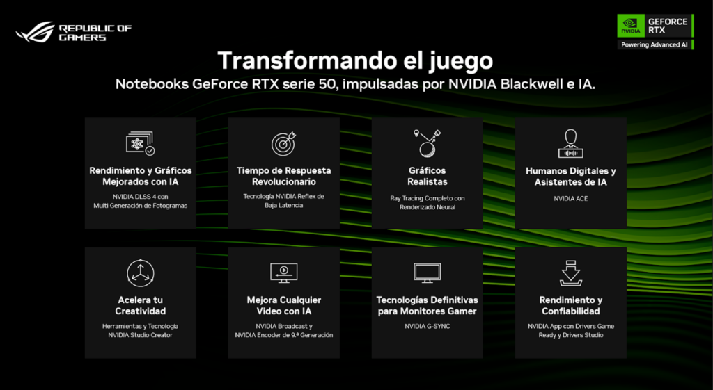 En el ámbito gamer, DLSS 4 permite multiplicar el rendimiento hasta por ocho mediante renderizado neuronal, mientras que NVIDIA Reflex 2 reduce la latencia hasta en un 75 %, brindando una experiencia fluida y responsiva.